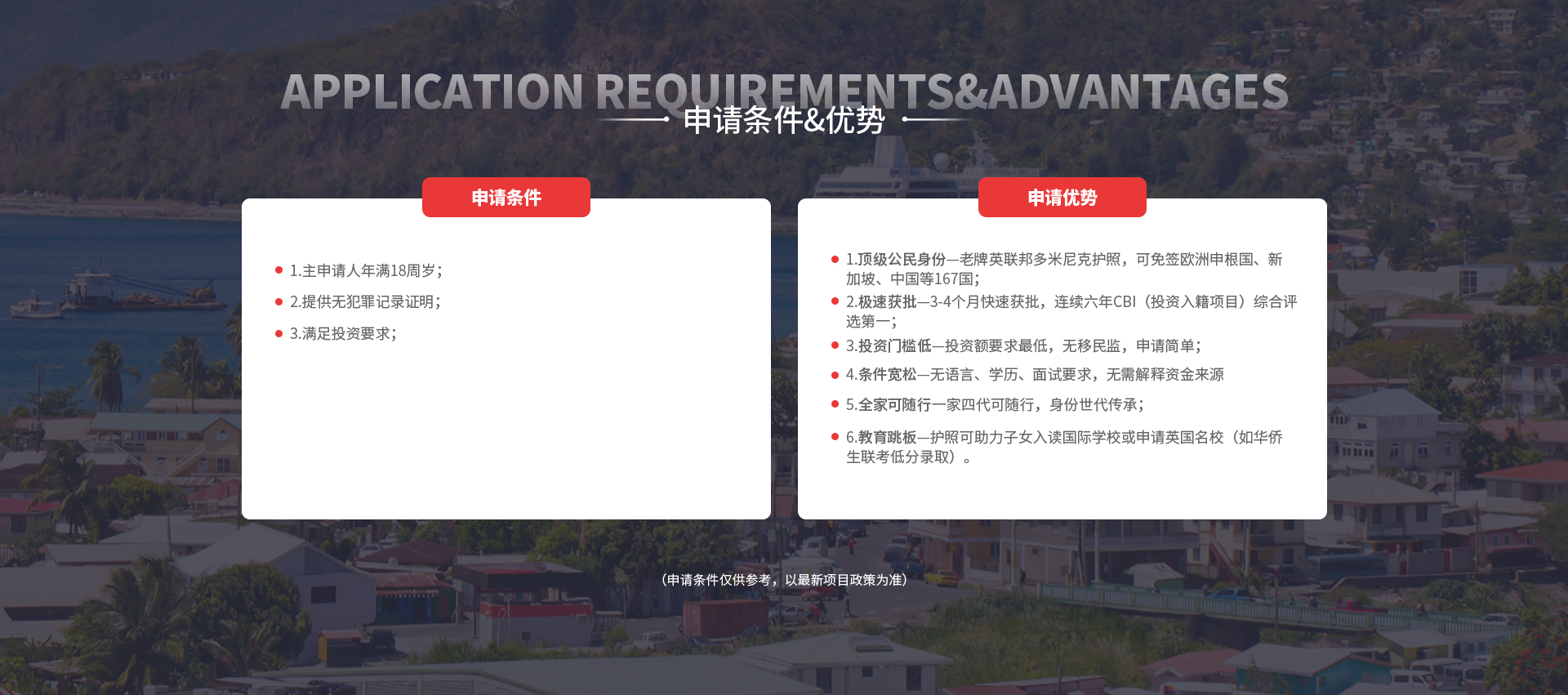 多米尼克投资入籍法案1993年开始颁布实施,由《多米尼克国宪法》制定。申请人可以选择向经济多样化基金捐款或投资房地产20万美元来获得公民身份。同时多米尼克护照持有者可以免签或落地签访问144个国家和地区,并享有和当地公民一样生活、工作的权利。