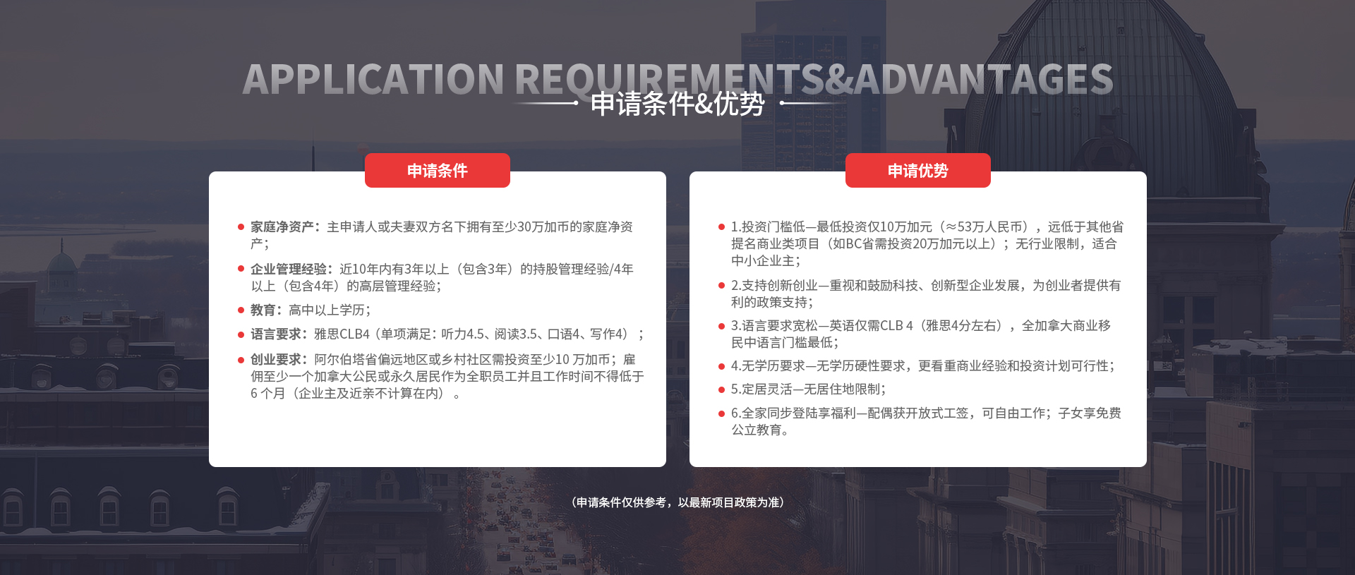 加拿大阿省企业家移民旨在吸引全球人才及激活乡村地区经济。该项目隶属于阿尔伯塔省提名计划(AAIP),为有志在小型社区创业的外国投资者提供了移民加拿大的新途径。该项目无需先拿永久居民身份即可在当地创业,投资要求低,多达100多个乡村社区项目可选,适合有明确区域和行业定位的外国企业家在其社区生活、工作和定居,最终拿到加拿大绿卡。