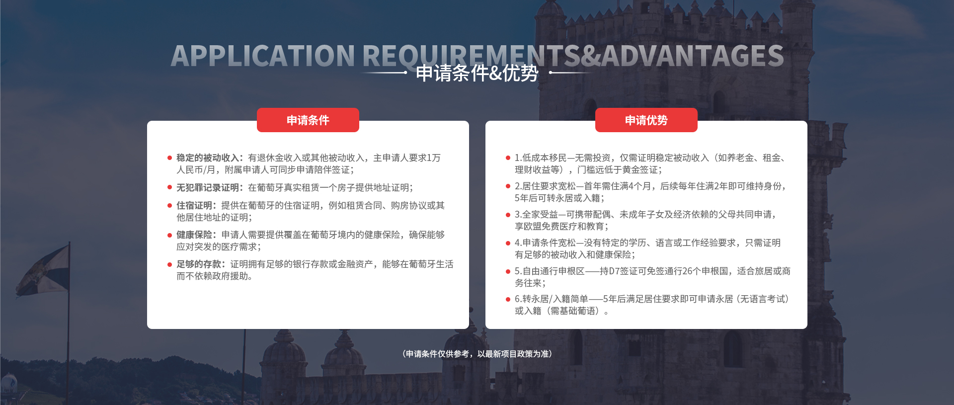 葡萄牙长期居留签证,又称D7签证,自推出以来,凭借其低门槛、低成本的优势,迅速成为非欧盟公民移居欧洲的热门选择。该签主要是吸引拥有稳定被动收入或远程工作收入的申请人,通过合法居留促进葡萄牙的消费与经济活力。申请人只需证明具备持续的收入来源(如退休金、租金、股息或远程工作收入),即可获得葡萄牙的居留权,并享受自由通行申根区、优质医疗教育等福利。持有该签证满5年后,还可进一步申请永久居留或入籍,享受全球自由流动、税务优化等多重优势。无论是退休人士、自由职业者,该签证都提供了一条高效、灵活的欧洲移民路径。