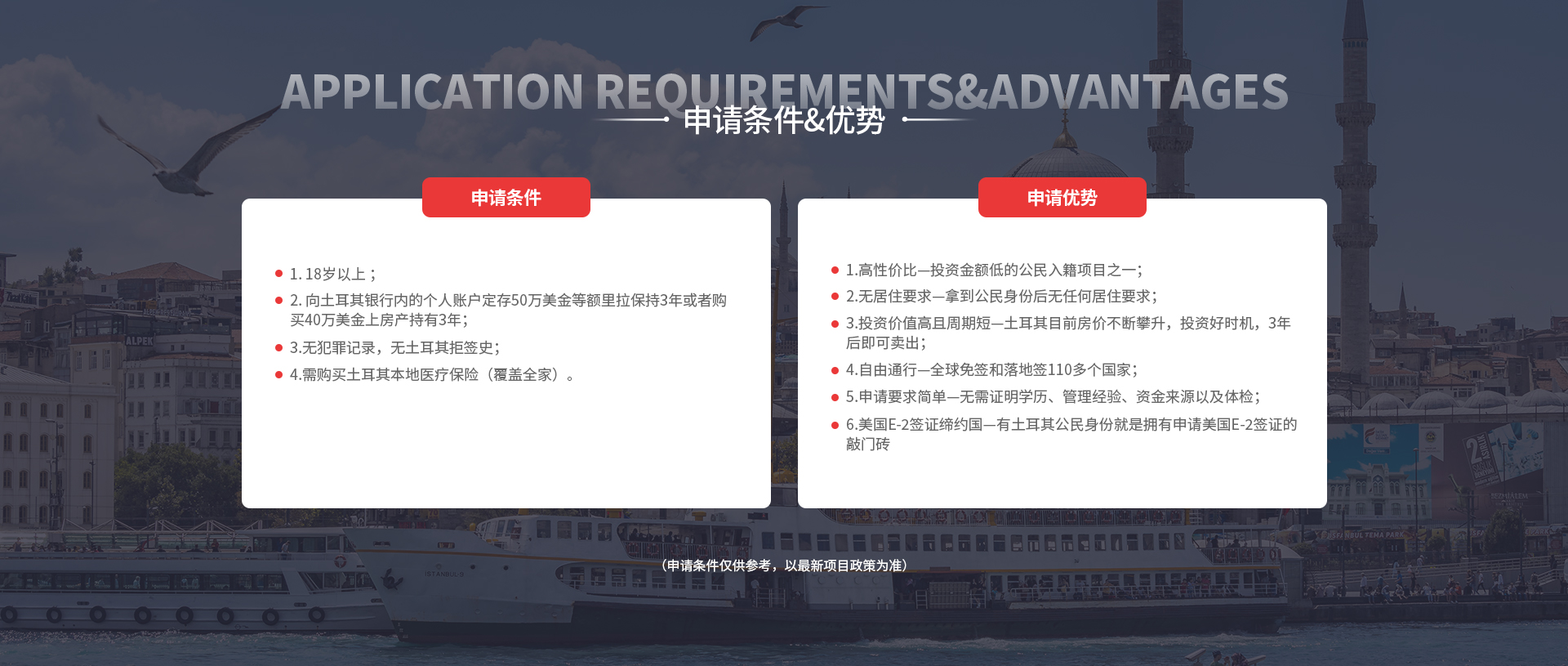 土耳其横跨欧亚两洲,因独特的地理位置吸引众多人群投资旅游,虽为亚洲国家但政治、经济、文化等均实行欧洲模式,是欧盟的候选国之一,因此土耳其投资入籍项目备受青睐。该项目一步到位即可拿护照,整体办理单人净花费28万左右,办理门槛低,无需捐款,无语言/无学历/无商业背景要求、无移民监,定存50万美金等额里拉保持3年或者购买40万美金以上房产持有3年,8个月左右即可拿护照,持土耳其护照免签多个国家和地区,例如日本,泰国,新加坡,香港,澳门等。