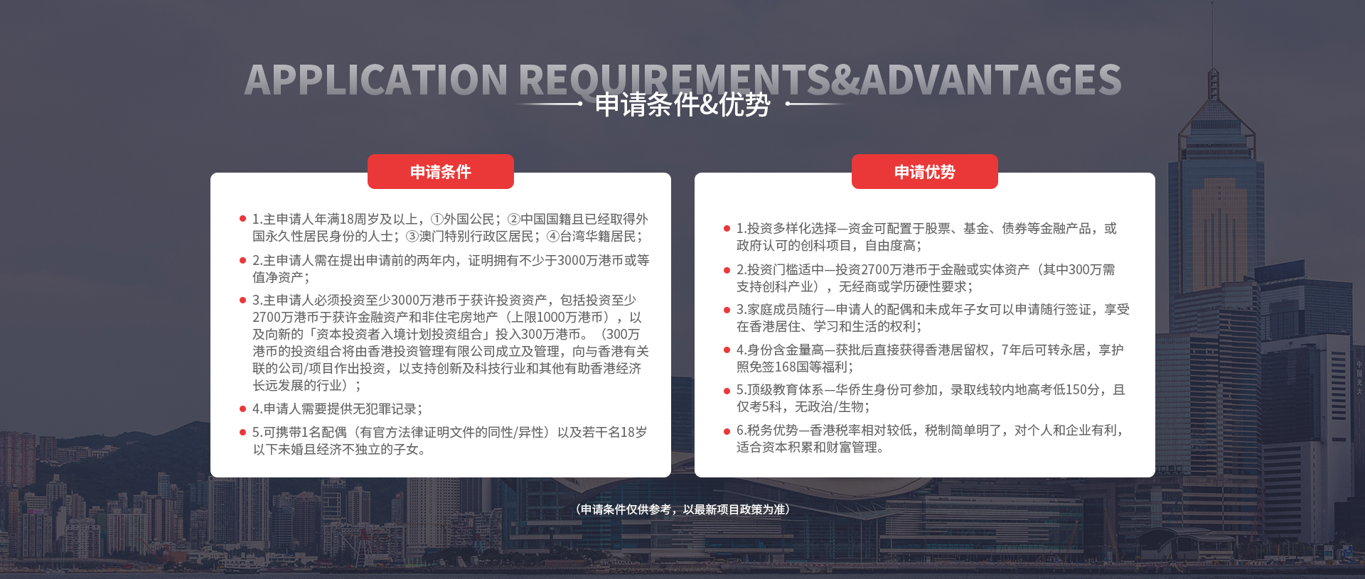 香港新资本投资者入境计划目的是吸引资产拥有人在香港落户发展,并透过调配和管理财富,发掘香港多元的投资机会。优化后的新政已于2025年3月1日起实施,资产审查期从原本的2年缩至6个月,同时在申请人与家庭成员共同拥有的净资产中,由申请人绝对实益拥有的份额也会获得考虑。只要你的资产达到要求,即可申请。续签不要求在港有工作,只要符合投资规定就可以续签,即使七年后未能满足永久居民资格,仍可申请无条件逗留签证。该项目没有配额限制,香港投资者可携带配偶以及18岁以下的未婚子女一起获得香港身份,一人移居,全家受益。