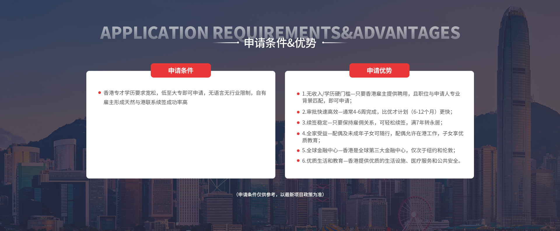 香港专才计划目的是吸引具备香港特区所需但本地又缺乏的特别技能、知识或经验的内地中国居民来港工作。 无配额限制,且涵盖各个行业,为不同领域的专业人才提供了广阔的发展空间。在学历要求上,虽然原则上要求申请人拥有本科学士学位,但凭借卓越的专业技能,大专学历的申请者也有机会获得批准。申请前必须先取得香港雇主的聘用,可以通过受雇、自雇、内部调职三种聘用方式申请工签。申请获批率高,续签要求中间不能随意更换雇主,要换工作必须先取得入境处处长的审批,续签7年后可获得永居。