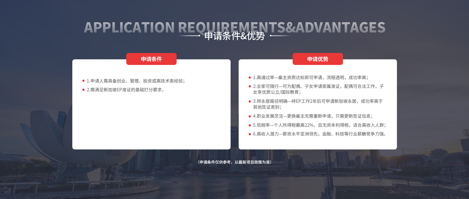 就业准证EP是新加坡人力部设置给外国专业人员(管理层,主管或专业职位)的工作准证。 以个人管理或技术经验为依托,通过一家成熟的新加坡公司来申请EP。月薪超过6000新币,即可为配偶、未满21周岁未婚子女申请家属准证DP。月薪超过12000新币,即可为主申父母申请长期社访签证. 新加坡国际排名及优势:全球治安佳,适合孩子成长,本地大学亚洲排名榜首;亚洲适合经商;医疗效率全球排名榜首;食品安全全球排名榜首;人均寿命全球排名榜首;房产近零泡沫。